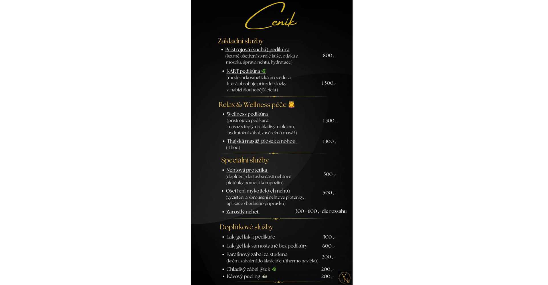 Služby, které nabízíme: přístrojová (suchá) pedikúra, KART pedikúra, péče o nehty, lakování nehtů, gel lak, nálepky, relaxace (masky, zábaly)